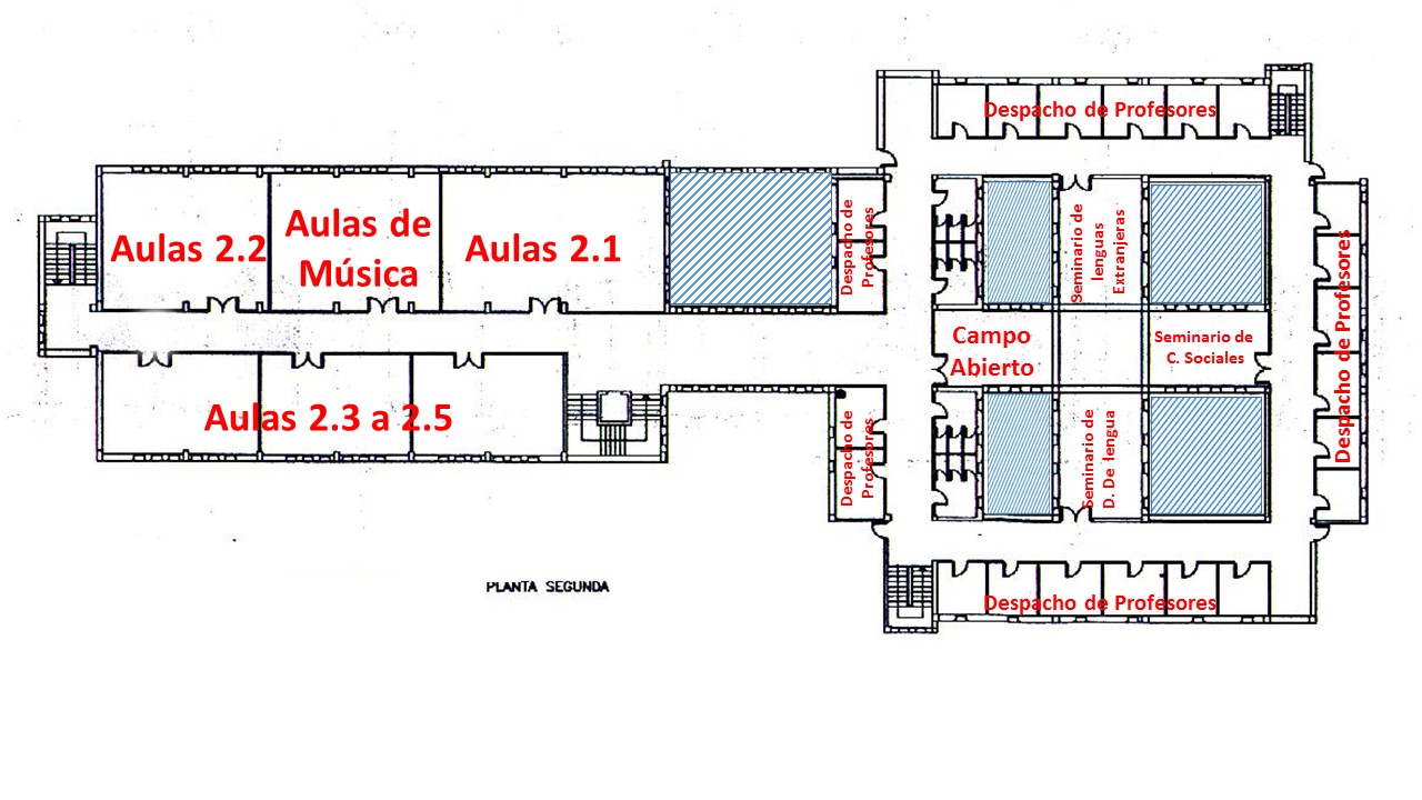 - Planta segunda E. Principal: Aulas 2.1 a 2.5, y Aula 2.6 de Informática.